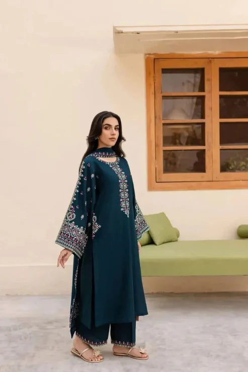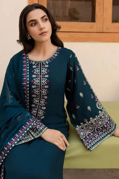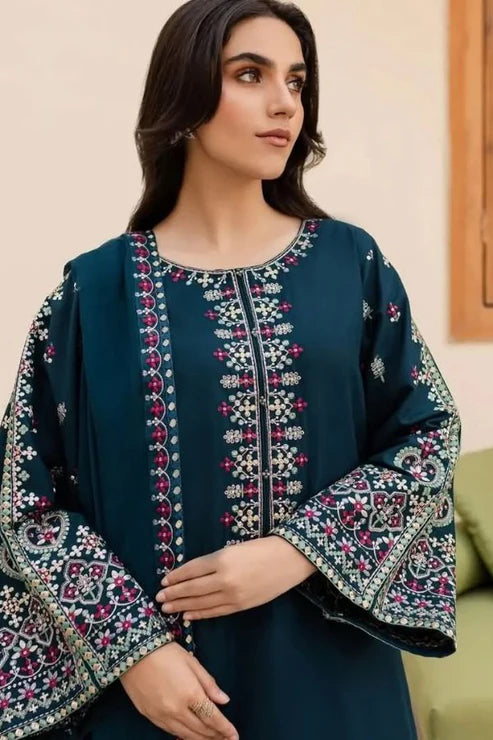 Elevate your style with sonoreta , a graceful 3-piece outfit designed for elegance and comfort. The rich black lawn cotton shirt is beautifully adorned with deep maroon embroidery on the neckline and cuffs, giving it a luxurious, festive touch. It’s paired with matching wide-leg trousers that featuring a stunning floral print that adds just the right amount of flair.